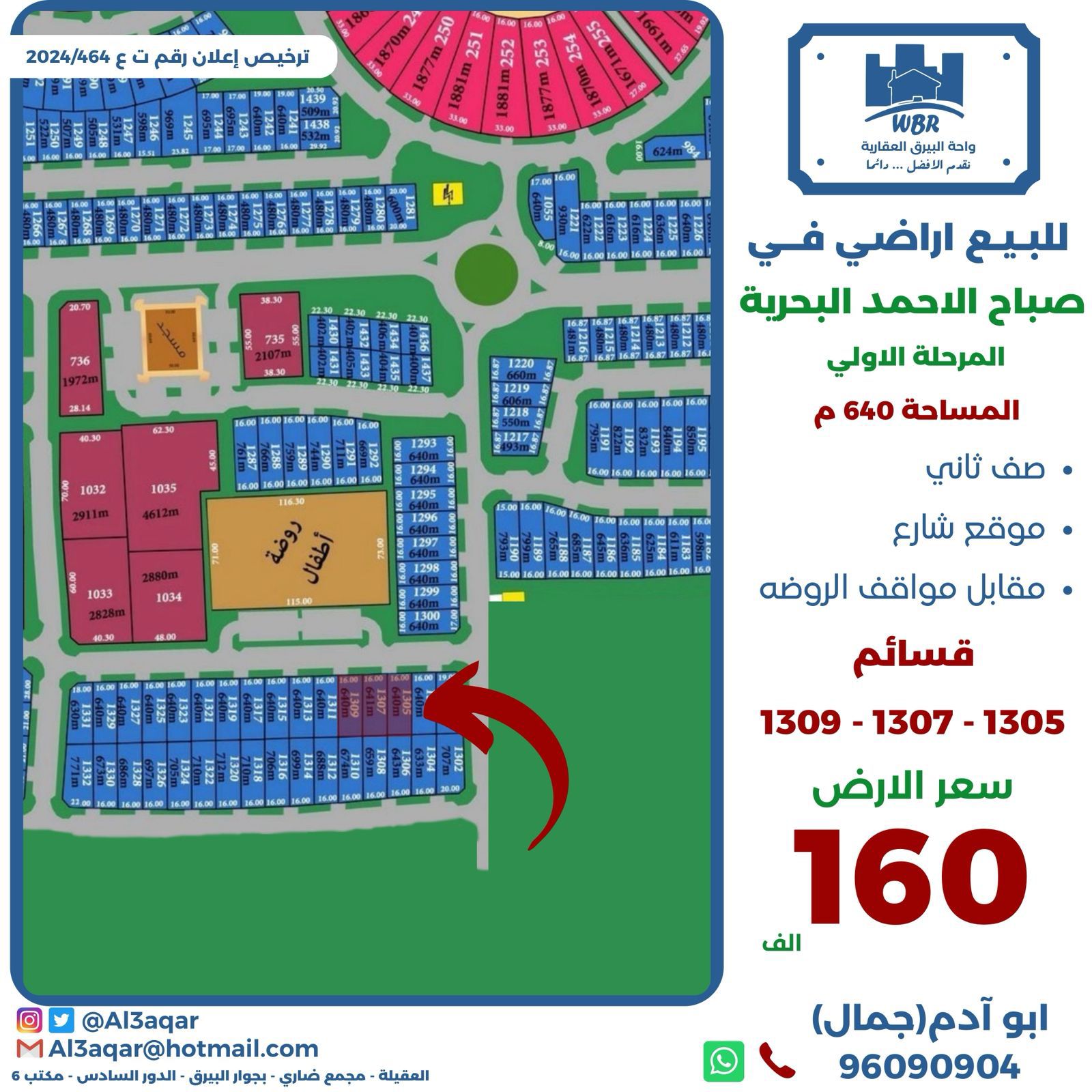 للبيع اراضى فى صباح الاحمد البحريه ، المرحله الاوله ، صف ثاني ، موقع شارع مقابل مواقف الروضه ، مساحه الارض 640 متر مربع ، قسيمه 1305 ، 1307، 1309 ، سعر الارض 160 ألف د.ك
