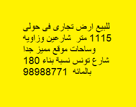 أرض تجارى للبيع فى حولى Share ملخص للبيع ارض تجارى فى حولى, مساحتها 1115 متر مربع , تقع على شارعين وزاويه وساحات موقع مميز جدا , شارع تونس نسبة بناء 180 بالمائه 98988771 التفاصيل Page Views الأماكن القريبة من جوجل Close