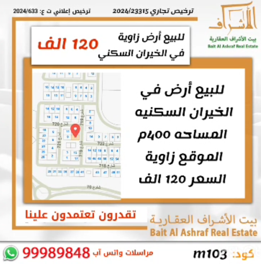 أرض زاوية للبيع بالخيران السكنى Share ملخص للبيع أرض فى الخيران السكنى ، مساحتها 400 متر مربع ، تقع على زاوية ، السعر 120 ألف دينار . بيت الأشراف العقارية تقدرون تعتمدون علينا ، مراسلات واتس اب 99989848 الكود m103 ، ترخيص إعلاني ت ع 2024 . 633 التفاصيل حالة: للبيع Page Views الأماكن القريبة من جوجل خصائص ذات صلة للبيع تجربة عنصر للبيع abdulrahman منذ أسبوعين للبيع د.ك111111 شقة تجربة عقار جديد خليل بوست أسرة: 666666 الحمامات: 666666 admin منذ 3 أسابيع Close