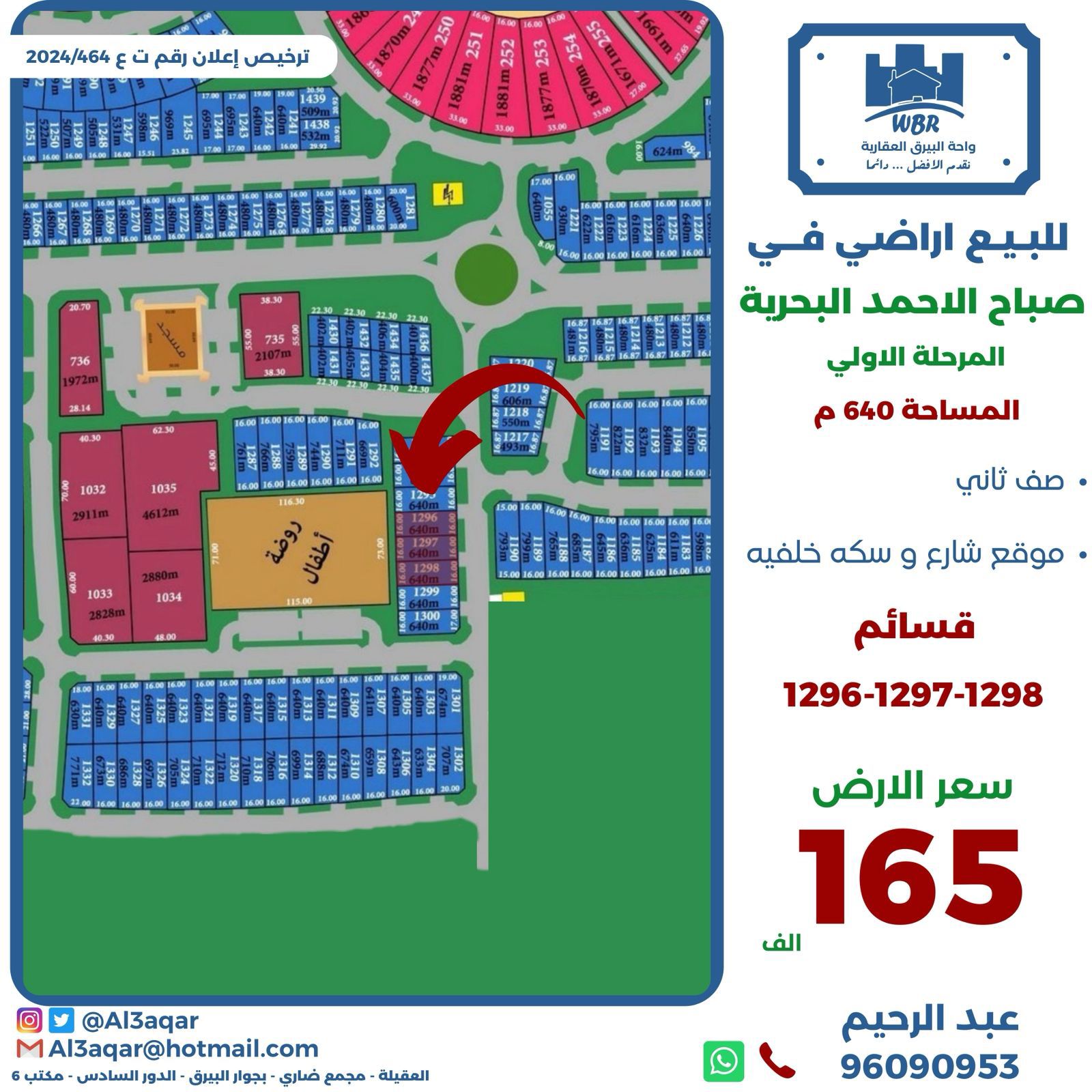 للبيع ارض فى صباح الاحمد البحريه، المرحله الاوله ، صف ثاني ، موقع شارع و سكه خلفيه ، مساحه الارض 640 متر مربع ، قسيمه 1296 فى 1297 فى 1298 ، سعر الارض 165 ألف د.ك