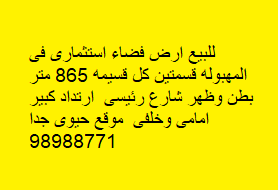 للبيع ارض فضاء استثمارى فى المهبوله ، قسمتين كل قسيمه مساحتها 865 متر مربع ، تقع على بطن وظهر شارع رئيسى ، ارتداد كبير ، امامى وخلفى ، موقع حيوى جدا 98988771