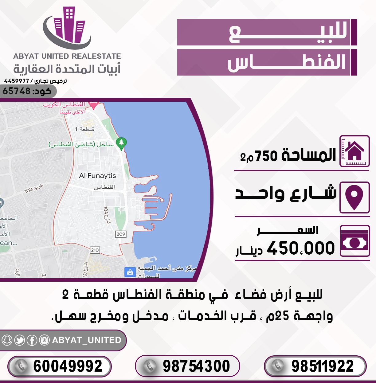 للبيع ارض فضاء فى منطقه الفنطاس ، قطعه 2 ، المساحة 750 متر مربع ، واجهة 25 متر ، قرب الخدمات ، مدخل ومخرج سهل .