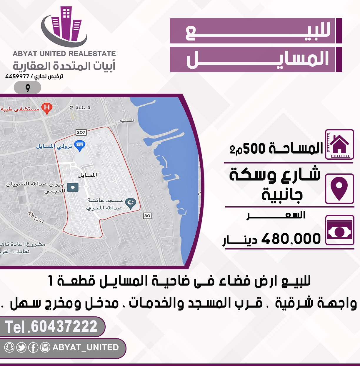 أرض فضاء للبيع فى المسايل Share ملخص للبيع ارض فضاء في ضاحية المسايل قطعة 1 ، الموقع شارع وسكة جانبية ، المساحة 500 مترمربع ، واجهة شرقية ، قرب المسجد والخدمات ، مدخل ومخرج سهل للاستفسار النقال 1 60437222 ، السعر 480 ألف دينار كويتى التفاصيل Page Views الأماكن القريبة من جوجل Close