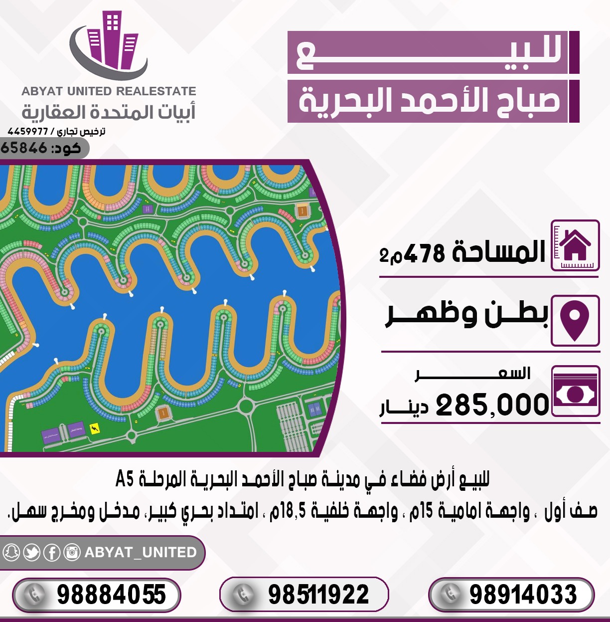 للبيع ارض فضاء فى مدينة صباح الاحمد البحرية المرحلة A5 ، المساحة 478 متر مربع ، الموقع بطن وظهر صف اول ، واجهة امامية 15 متر ، واجهة خلفية 18.5 متر ، امتداد بحري كبير ، مدخل وخرج سهل .
