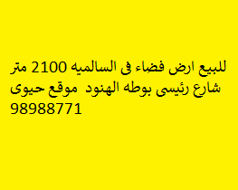 أرض للبيع فى السالميه موقع حيوى Share ملخص للبيع ارض فضاء فى السالميه ، مساحتها 2100 متر مربع ، تقع على شارع رئيسى بوطه الهنود ، موقع حيوى 98988771 التفاصيل حالة: للبيع Page Views الأماكن القريبة من جوجل خصائص ذات صلة للبيع تجربة عنصر للبيع abdulrahman منذ أسبوعين للبيع د.ك111111 شقة تجربة عقار جديد خليل بوست أسرة: 666666 الحمامات: 666666 admin منذ 3 أسابيع Close