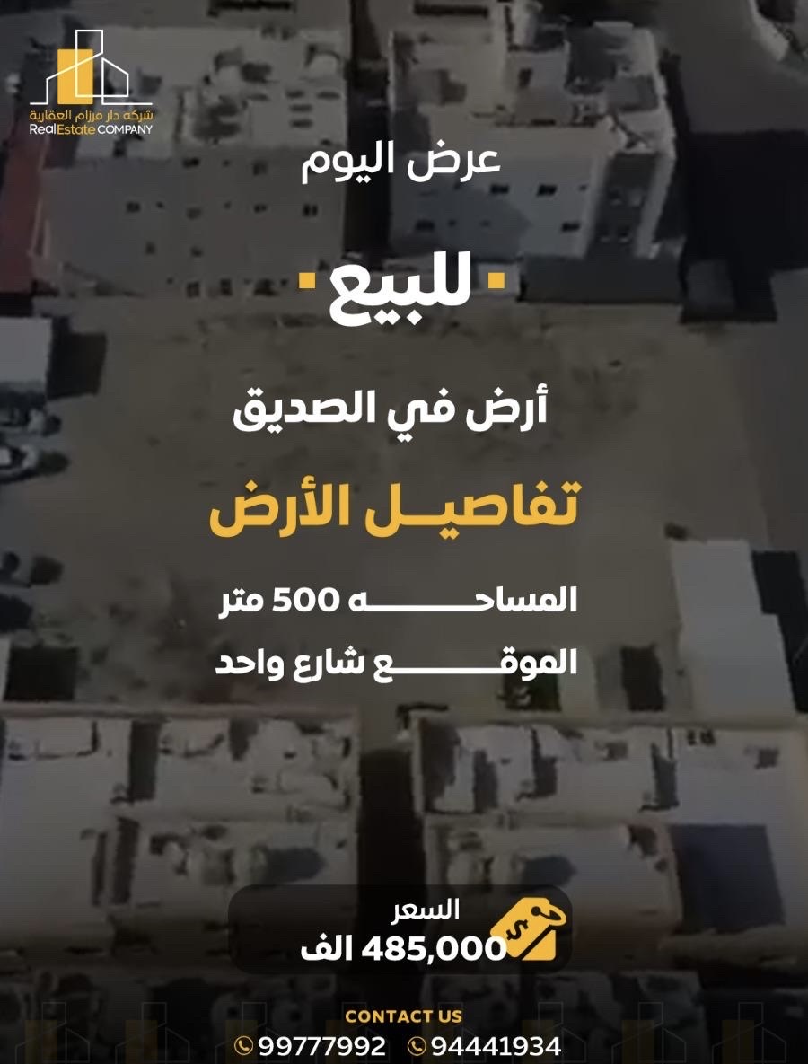 أرض للبيع فى الصديق شارع واحد Share ملخص للبيع ارض في الصديق ، المساحه 500 متر مربع , الموقع شارع واحد ، سعر البيع 485,000 ألف د.ك التفاصيل Page Views الأماكن القريبة من جوجل Close