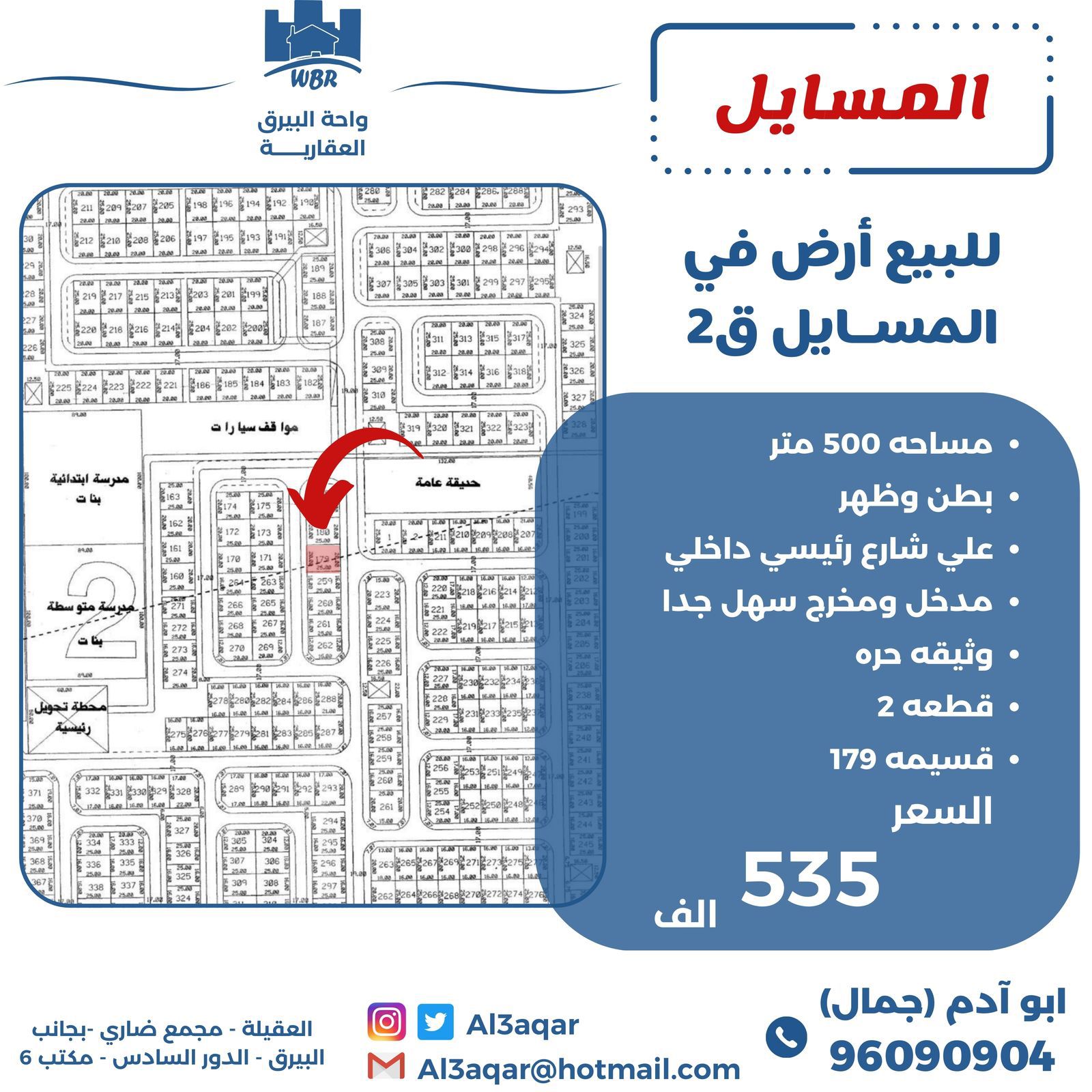 أرض للبيع فى المسايل قطعة 2 بطن وظهر Share ملخص للبيع أرض فى المسايل قطعة 2 ، مساحتها 500 متر مربع ، تقع على بطن وظهر على شارع رائيسي داخلي ، مدخل ومخرج سهل جدا ، وثيقه حره ، قسيمه رقم 179 ، السعر 535 ألف د.ك . التفاصيل حالة: للبيع Page Views الأماكن القريبة من جوجل خصائص ذات صلة للبيع تجربة عنصر للبيع abdulrahman منذ أسبوعين للبيع د.ك111111 شقة تجربة عقار جديد خليل بوست أسرة: 666666 الحمامات: 666666 admin منذ 3 أسابيع Close