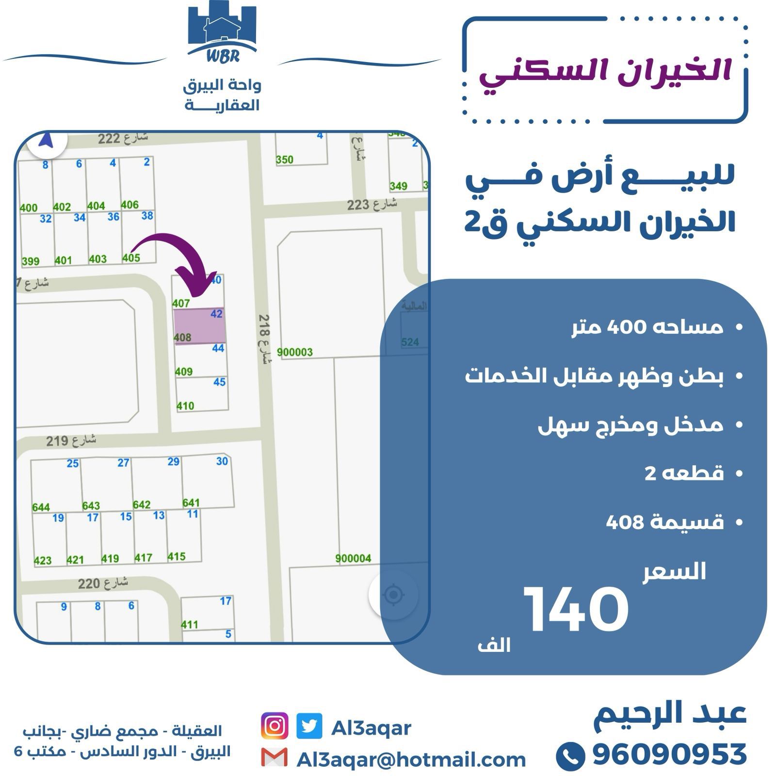 أرض للبيع فى منطقة الخيران السكنى بطن وظهر Share ملخص للبيع أرض فى الخيران السكني قطعة 2 ، مساحتها 400 متر مربع ، تقع على بطن وظهر مقابل الخدمات ، قسيمة رقم 408 ، مدخل ومخرج سهل السعر 140 ألف د.ك . التفاصيل حالة: للبيع Page Views الأماكن القريبة من جوجل خصائص ذات صلة للبيع تجربة عنصر للبيع abdulrahman منذ 3 أسابيع للبيع د.ك111111 شقة تجربة عقار جديد خليل بوست أسرة: 666666 الحمامات: 666666 admin منذ 4 أسابيع Close