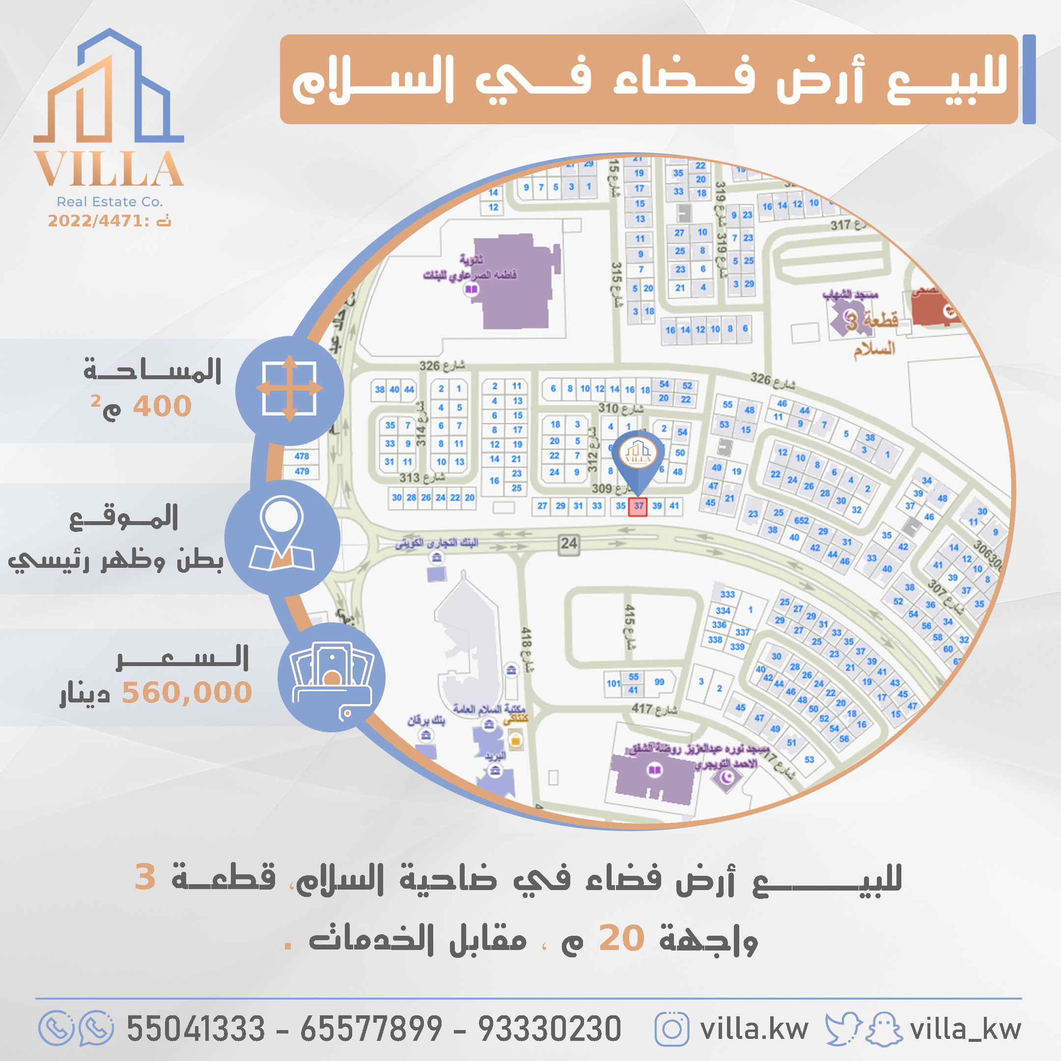 للبيع أرض فضاء في ضاحية بالسلام ، قطعة 3 ، المساحة 400 متر مربع ، تقع على بطن وظهر رئيسي وارتداد ، واجهة 20 متر ، مقابل الخدمات ، السعر 560 ألف د.ك ، ترخيص 2022 4471 ، للاستفسار ، نقال1، 93330230 ، نقال2، 55041333 ، نقال3، 65577899