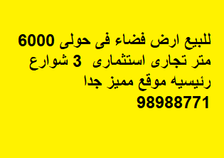ارض تجارية للبيع فى حولي Share ملخص للبيع ارض فضاء فى حولى ، مساحتها 6000 متر مربع ، تجارى استثمارى ، تقع على 3 شوارع رئيسيه ، موقع مميز جدا 98988771 التفاصيل حالة: للبيع Page Views الأماكن القريبة من جوجل خصائص ذات صلة للبيع تجربة عنصر للبيع abdulrahman منذ أسبوعين للبيع د.ك111111 شقة تجربة عقار جديد خليل بوست أسرة: 666666 الحمامات: 666666 admin منذ 3 أسابيع Close