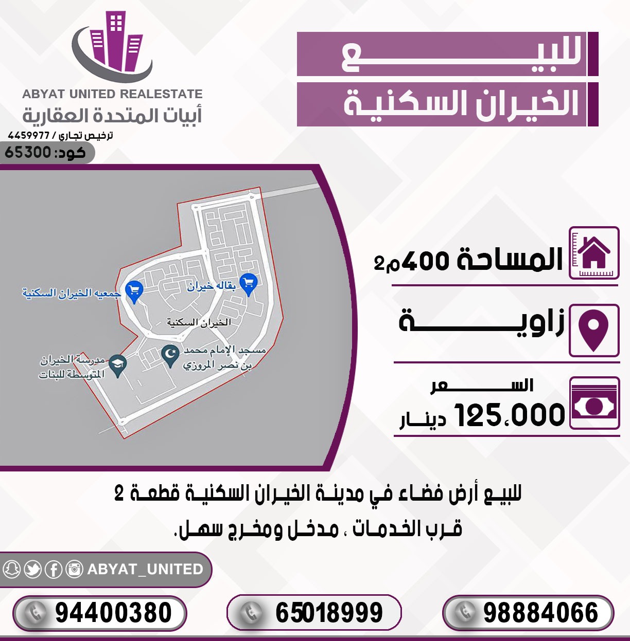 للبيع ارض فضاء في مدينة الخيران السكنية ، قطعة 2 ، تقع على زاوية ، مساحتها 400 متر مربع ، قرب الخدمات ، مدخل ومخرج سهل .