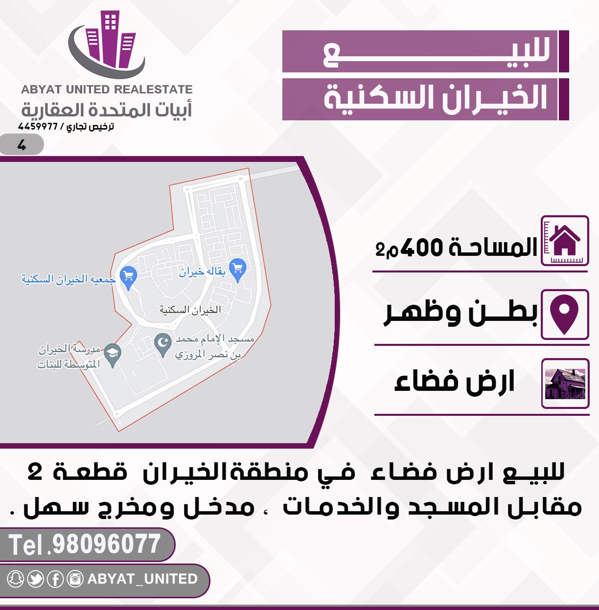 ارض فضاء للبيع فى الخيران السكنى Share ملخص للبيع ارض فضاء فى منطقة الخيران السكنى ، قطعة 2 ، تقع على بطن وظهر ، مساحتها 400 متر مربع ، مقابل المسجد والخدمات ، مدخل ومخرج سهل ، للاستفسار النقال1 98096077 . التفاصيل Page Views الأماكن القريبة من جوجل Close