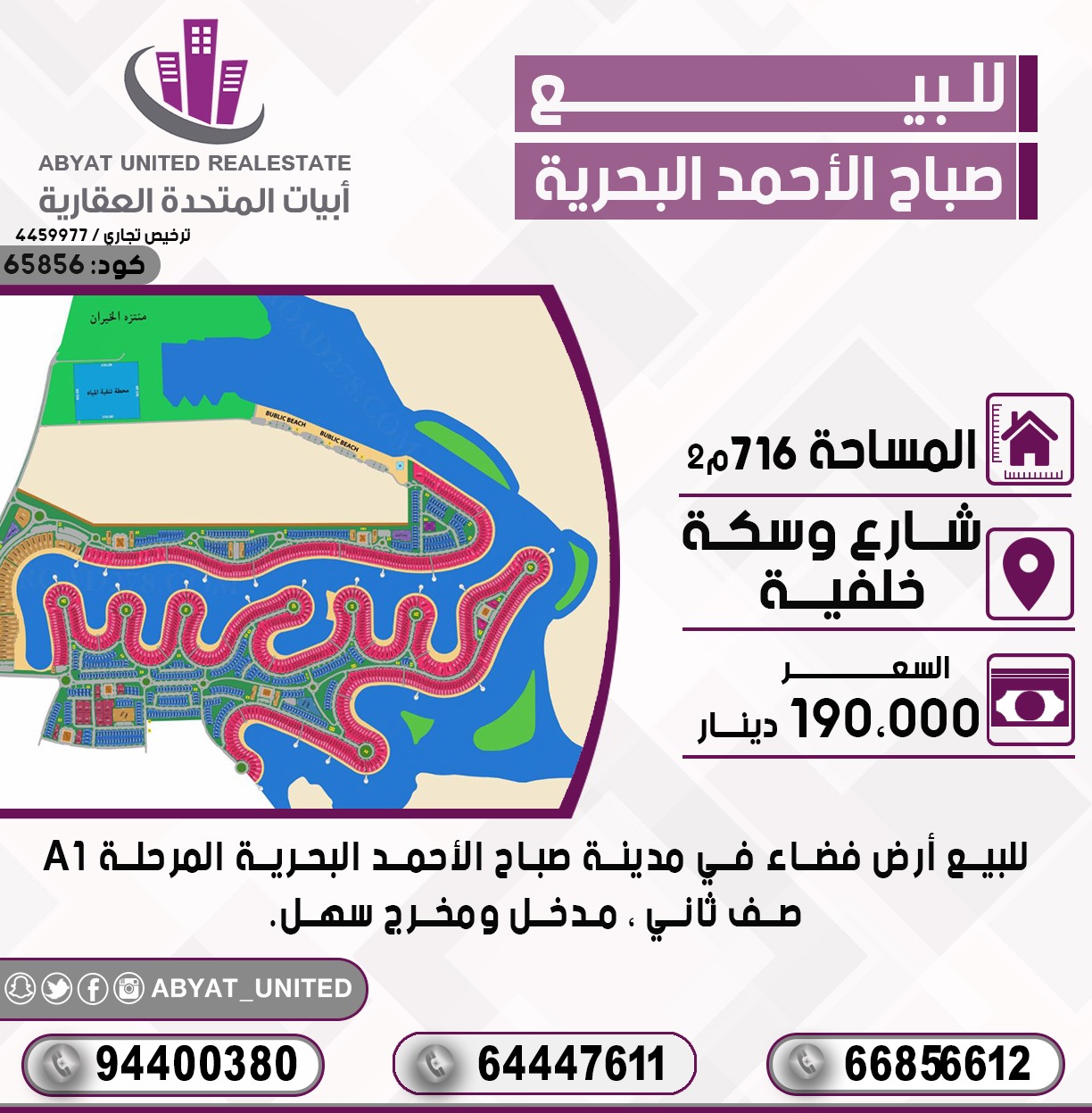 للبيع ارض فضاء فى مدينة صباح الاحمد البحرية ، المرحلة A1 ، المساحة 716 متر مربع ، الموقع شارع وساحة خلفية ، صف ثاني ، مدخل وخرج سهل ،