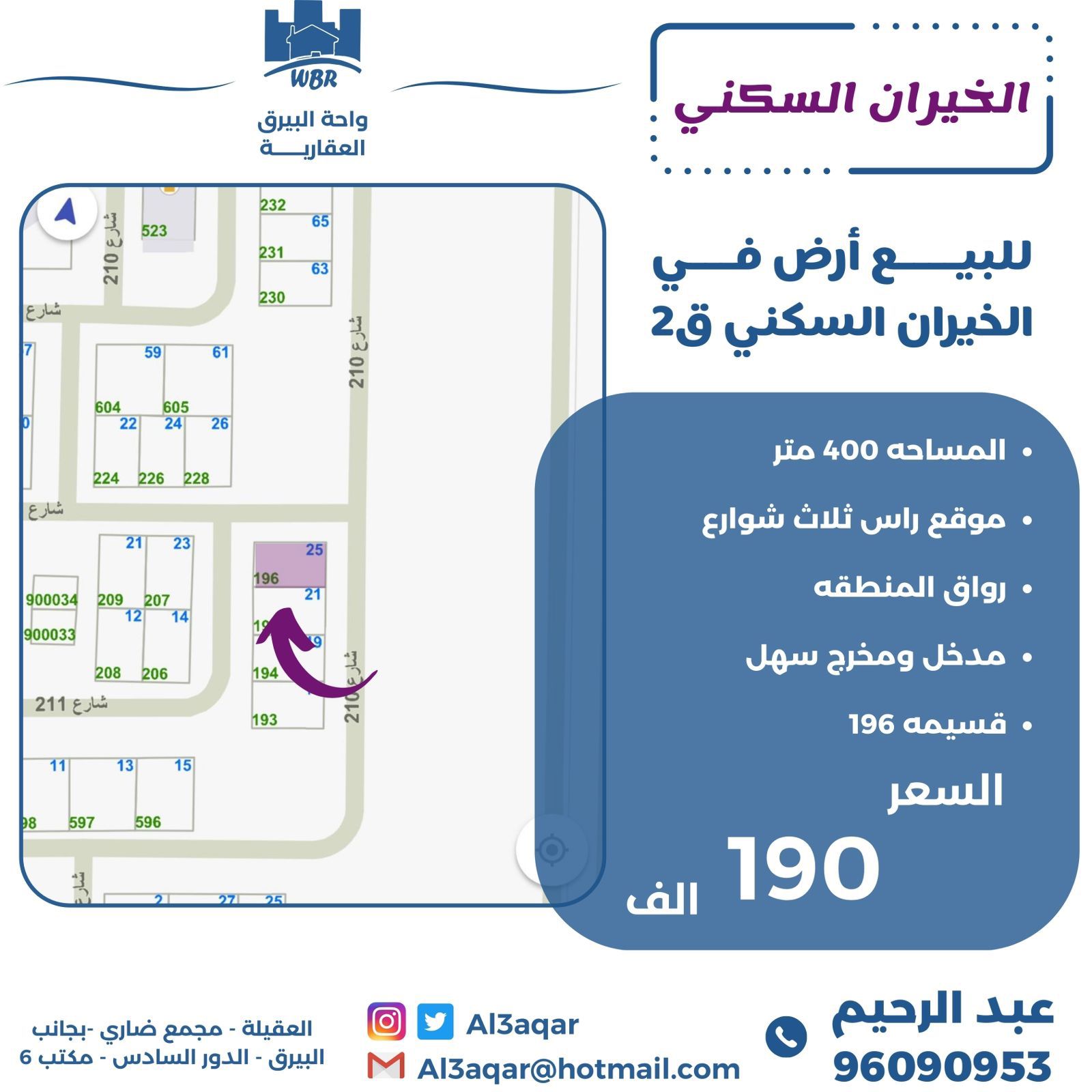 للبيع أرض في الخيران السكنيه ، قطعه 2 ، مساحه 400 متر مربع ، موقع راس ثلاث شوارع ، رواق المنطقه ، مدخل ومخرج سهل ، قسيمه 196 ، السعر 190 ألف د.ك