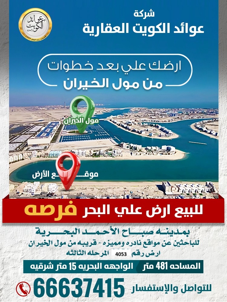 للبيع ارض اول خور ، اطلالة مقابل مول الخيران ، طريق 278 ، واجهة شرقية المرحلة الثالثة C ، رقم 4053 في المرحلة الثالثة عند مول الخيران ، مساحتها 481 متر مربع ، الموقع بطن وظهر ، واجهة شرقية اول خور عند مول الخيران ، مدخل ومخرج سهل طريق 278 ، الواجهة بحرية 15متر الواجهة الخلفية 15 متر