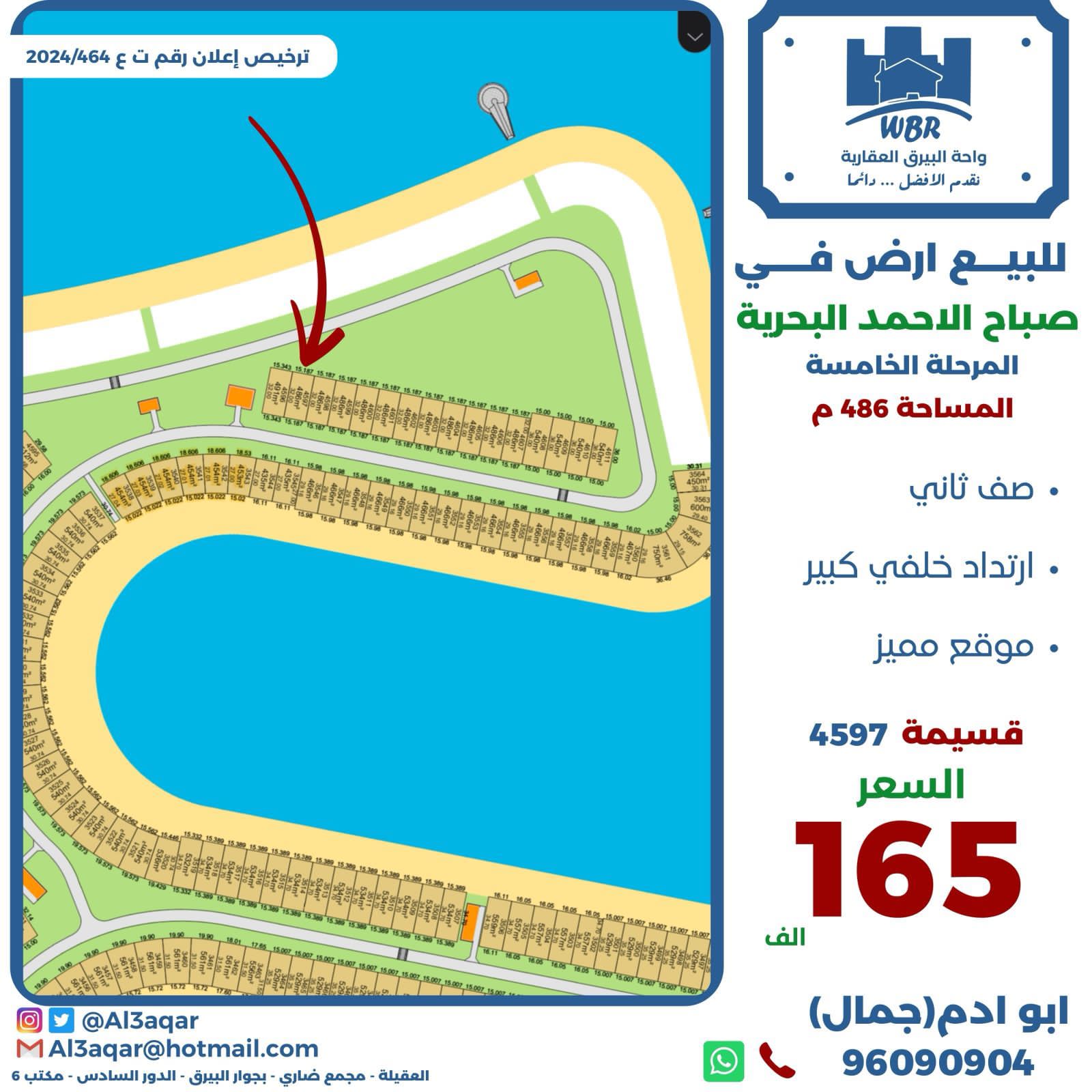 للبيع ارض فى صباح الاحمد البحرية ، المرحلة الخامسة ، المساحه 486 متر مربع ، صف ثاني ، ارتداد خلفي ، موقع مميز ، قسيمة 4597 ، السعر 165 ألف د.ك