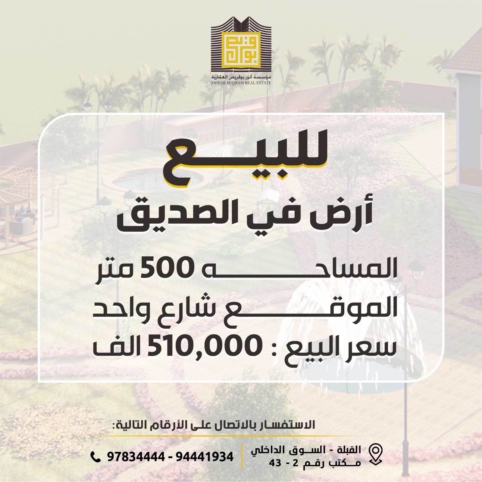 للبيع ارض في الصديق ، المساحه 500 متر مربع ، الموقع شارع واحد ، سعر البيع 510000 ألف د.ك ، للأستفسار باللأتصال أو الواتسب ، 97834444 ، 94441934
