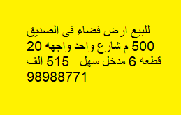 للبيع ارض فضاء فى الصديق ، مساحتها 500 متر مربع ، تقع على شارع واحد ، واجهه 20 ، قطعه 6 ، مدخل سهل ، 515 ألف د.ك ، 98988771