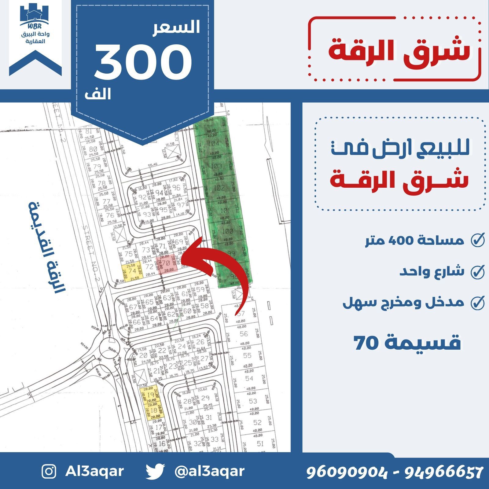 للبيع أرض فى شرق الرقة ، مساحتها 400 متر مربع ، تقع على شارع واحد ، مدخل ومخرج سهل ، قسيمة رقم 70 ، السعر 300 ألف د.ك .