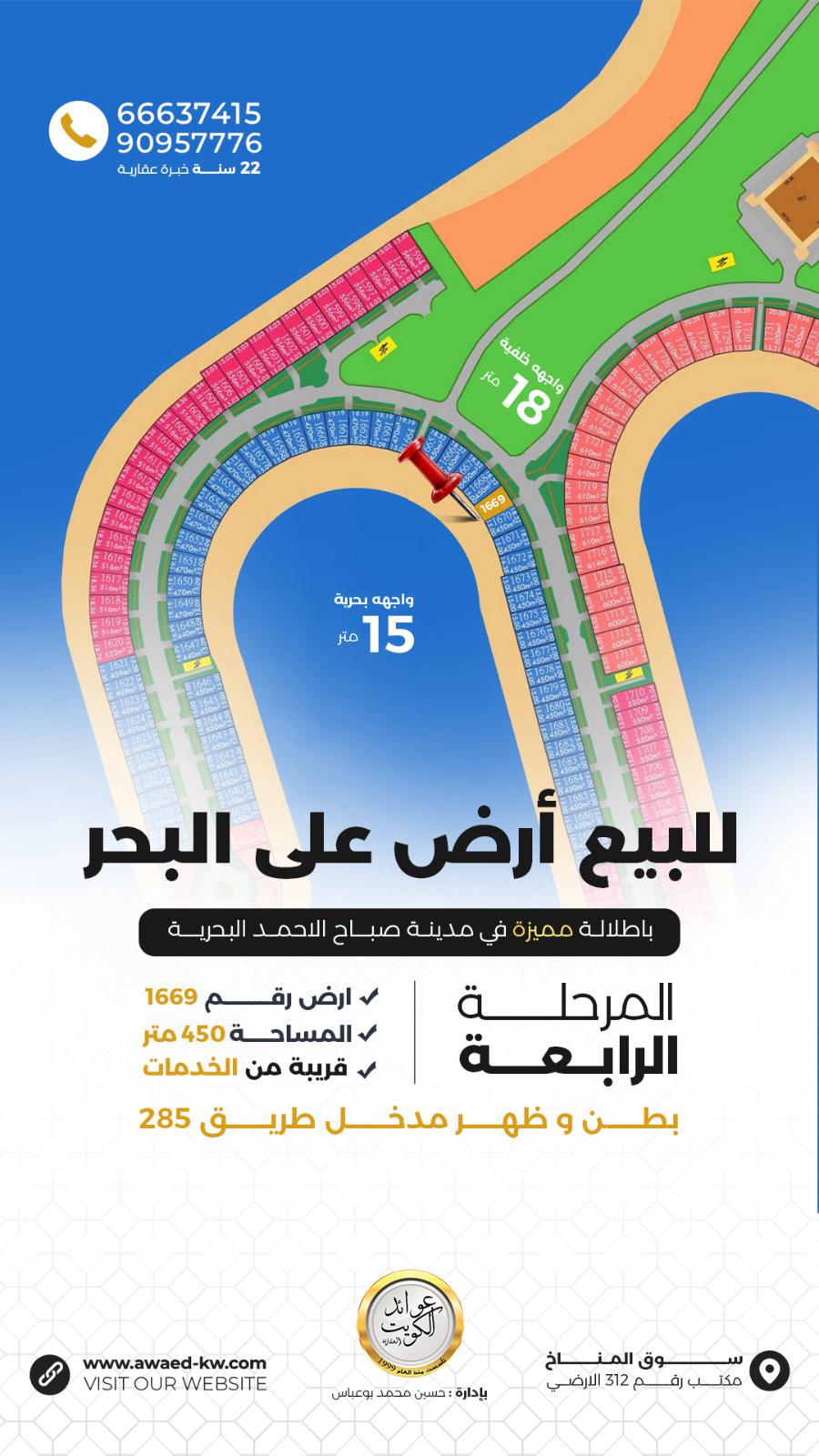 للبيع أرض علي البحر باطلاله مميزة في مدينه صباح الاحمد البحريه ، المرحلة الرابعة ، قريبة من المدخل و الخدمات مدخل من طريق 285 ، ارض رقم 1669 ، مساحتها 450 متر مربع ، واجهة بحرية 15 متر ، واجهة خلفية 18متر