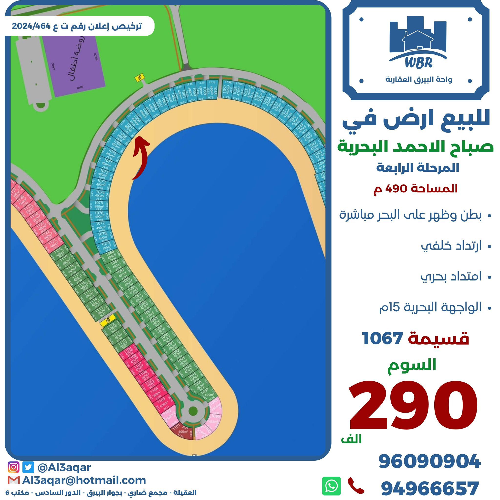للبيع ارض في صباح الاحمد البحرية. المرحلة الرابعة ، المساحة 490 متر مربع ، تقع على بطن وظهر ، على البحر مباشرة ارتداد خلفي امتداد بحري الواجهه 15 متر ، قسيمة 1067 ، السوم 290 ألف د.ك