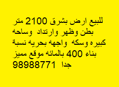 للبيع ارض بشرق ، مساحتها 2100 متر مربع ، تقع على بطن وظهر وارتداد وساحه كبيره وسكه ، واجهه بحريه ، نسبة بناء 400 بالمائه موقع مميز جدا 98988771