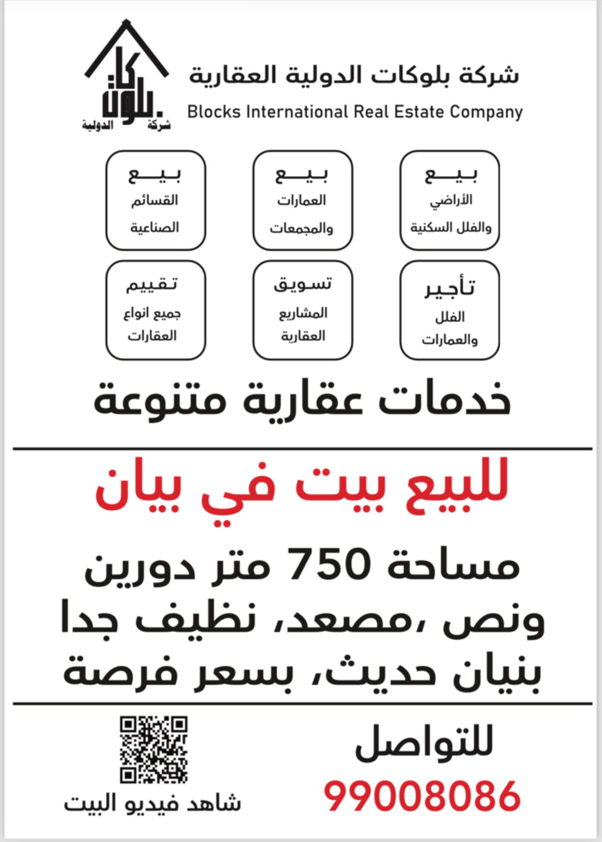 بيت استثمارى للبيع فى منطقه بيان Share ملخص للبيع بيت فى بيان ، مساحته 300 متر مربع ، يقع على شارع واحد ، يتكون من دورين ، مؤجر ، مدخول شهري 1400 دينار فرصة لإستثمار ، مدخل و مخرج سهل التفاصيل حالة: للبيع Page Views الأماكن القريبة من جوجل خصائص ذات صلة للبيع تجربة عنصر للبيع abdulrahman منذ أسبوعين للبيع د.ك111111 شقة تجربة عقار جديد خليل بوست أسرة: 666666 الحمامات: 666666 admin منذ 3 أسابيع Close