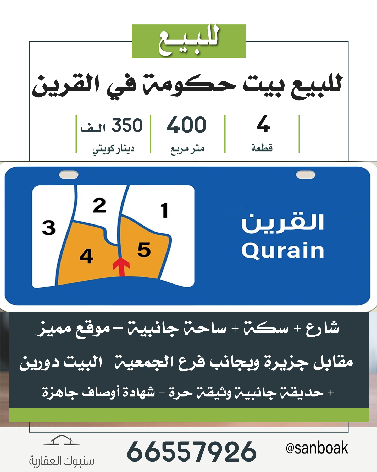 للبيع بيت حكومة في القرين ، قطعة 4 ، الموقع شارع وسكة و ساحة جانبية ، موقع مميز ، مقابل جزيرة وبجانب فرع الجمعية ، المساحة 400 متر مربع ، المواصفات دورين ، حديقة جانبية ، البيت على وضع الحكومة ، ارتداد كبير 22 متر وثيقة حرة ، شهادة أوصاف جاهزة ، فاضى ، تسليم فورى ، موقع استراتيجي قريب من الخدمات ، مدخل ومخرج سهل