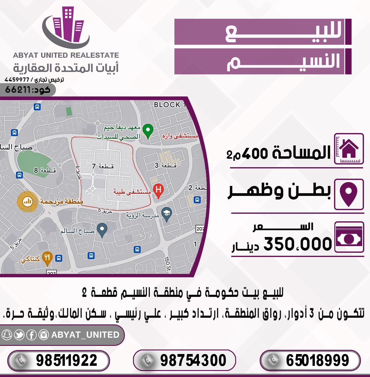 للبيع بيت حكومة في منطقه النسيم قطعه 2 ، الموقع بطن وظهر ، المساحة 400 متر مربع ، تتكون من 3 ادوار ، رواق المنطقه ، ارتداد كبير ، علي شارع رئيسي ، سكن المالك ، وثيقه حرة .
