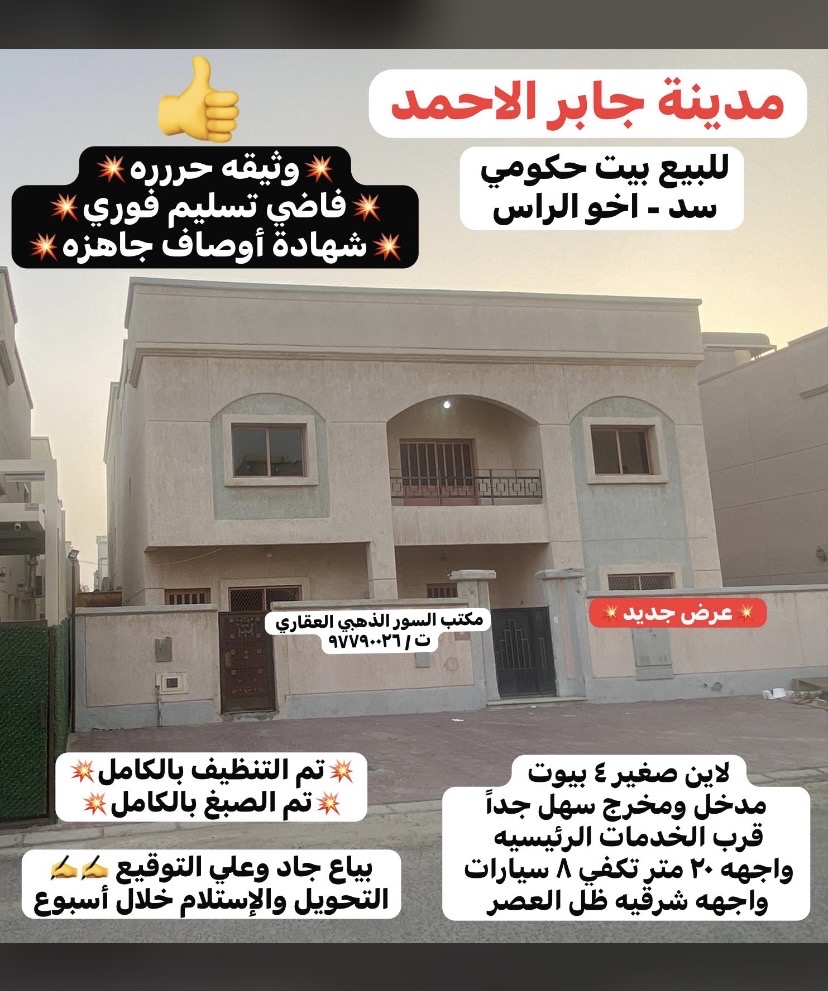 فرصه للجادين ، إستلم بيتك خلال اسبوع ، للبيع بيت حكومي جابر الاحمد ، وثيقه حره ، فاضي تسليم فوري ، شهادة أوصاف جاهزه نظيف جداً جاهز للسكن ، يتكون من دورين وربع ، مساحته 400 متر مربع ، موقع سد اخو الراس ، يفتح شرق ظلال العصر ، لاين صغير 4 بيوت ، بجانب الجمعيه والخدمات الرئيسيه ، مدخل ومخرج سهل جداً يمنع المكات ، السور الذهبي العقاريه تليفون 97790026 رقم الترخيص 2012.4696