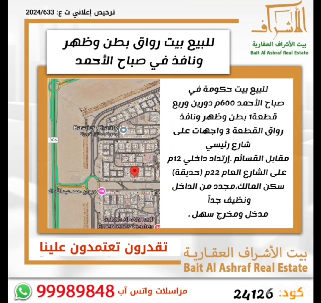 للبيع بيت حكومه فى صباح الاحمد السكنيه ، مساحته 600 متر مربع ، يتكون من دورين وربع ، قطعه واحد ، يقع على بطن وظهر ونافذ ، رواق القطعه ، ثلاث واجهات على شارع رئيسي ، مقابل القسائم والارتداد داخلي 12 متر على الشارع العام 22 متر حديقه سكن المالك مجدد من الداخل ونظيف جدا مدخل ومخرج سهل ، كود 24126 ، ترخيص اعلان 633 ، 2024 مراسلات وتساب 99989848
