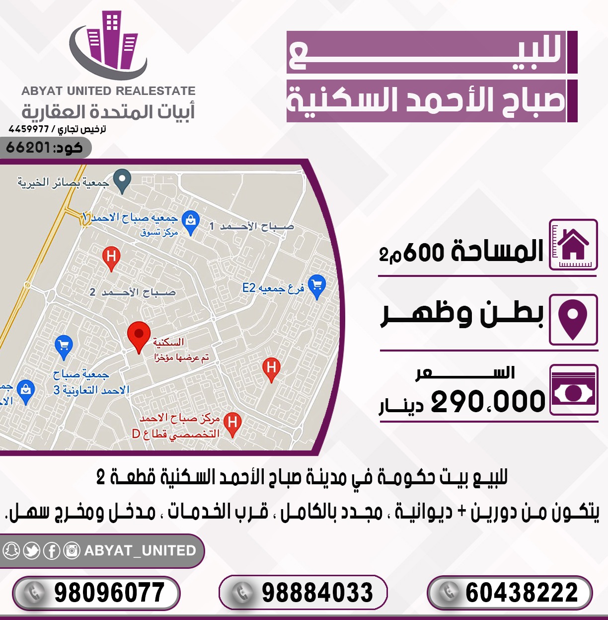 للبيع بيت حكومه في مدينة صباح الاحمد ىالسكنيه قطعه 2 الموقع بطن وظهر ، المساحة 600 متر مربع ، يتكون من دورين ، ديوانيه ، مجدد بالكامل ، مدخل ومخرج سهل ، قرب الخدمات .