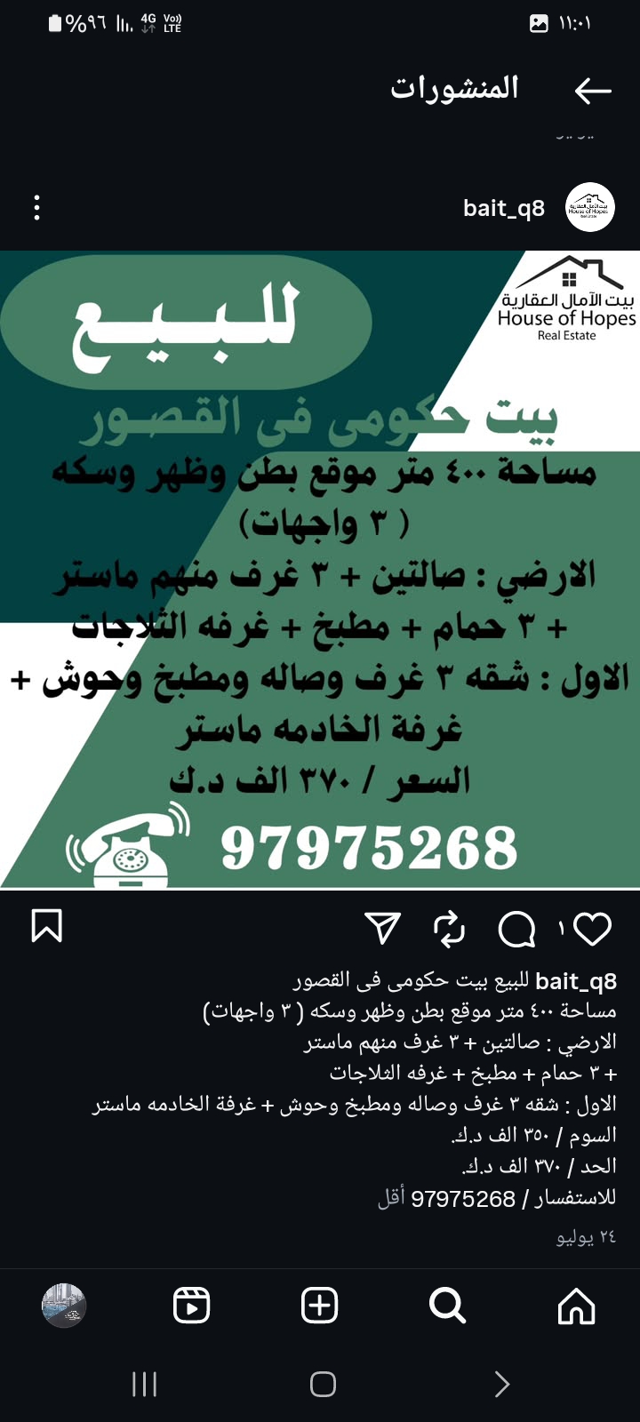 بيت حكومي للبيع في القصور Share ملخص بيت حكومي للبيع بالقصور ، مساحته 400 متر مربع ، يقع على بطن وظهر وسكه ، ثلاث واجهات. الارضى صالتين ثلاث غرف ومطبخ وغرفه الثلاجات ، الاول شقه ثلاث غرف وصاله ومطبخ وحوش وغرفه خادمه ماستر السعر 370 ألف دينار كويتي التفاصيل حالة: للبيع Page Views الأماكن القريبة من جوجل خصائص ذات صلة للبيع تجربة عنصر للبيع abdulrahman منذ 3 أسابيع للبيع د.ك111111 شقة تجربة عقار جديد خليل بوست أسرة: 666666 الحمامات: 666666 admin منذ 4 أسابيع Close