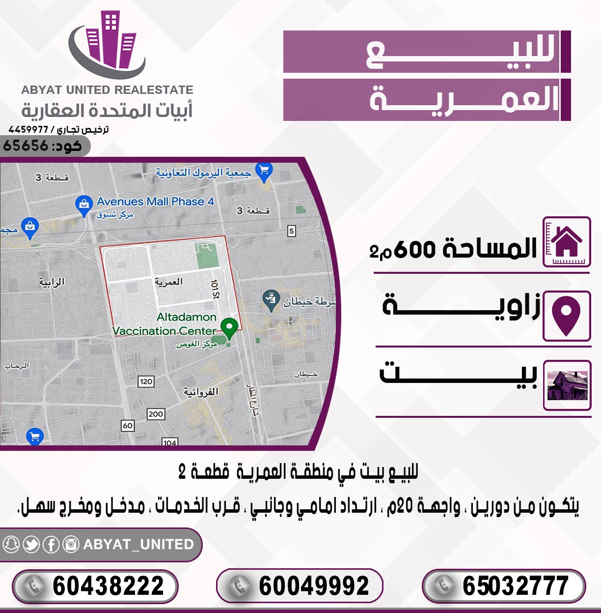 للبيع بيت فى منطقة العمرية قطعة 2 ، يقع على زاوية ، المساحة 600 متر مربع ، يتكون من دورين ، واجهة 20 متر ، ارتداد امامى وجانبى ، قرب الخدمات ، مدخل ومخرج سهل .