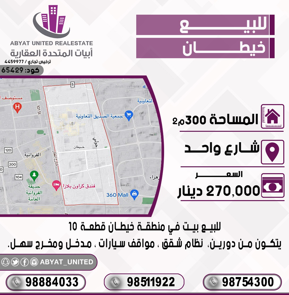 للاستفسار ، النقال 1 98884033 ، النقال 2 98511922 ، النقال 3 98754300 ، السعر 270 ألف دينار ، الكود 65429