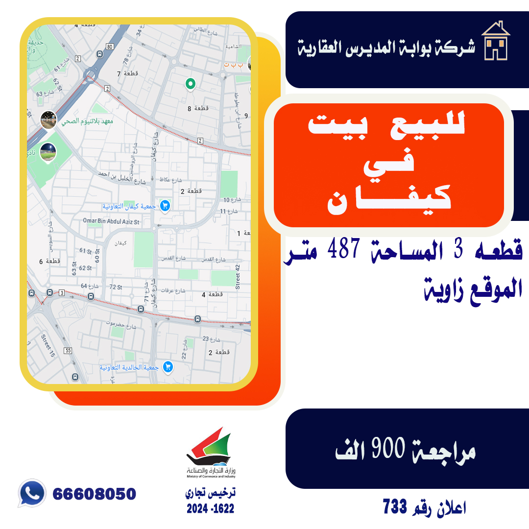 بيت قديم للبيع فى كيفان Share ملخص للبيع بيت قديم في كيفان قطعه 3 ، المساحة 487 متر مربع ، الموقع زاوية ، مشطوفة مراجعه 900 ألف د.ك يمنع الوسطاء شركة بوابة المديرس العقاري اعلان رقم 733 التفاصيل Page Views الأماكن القريبة من جوجل Close