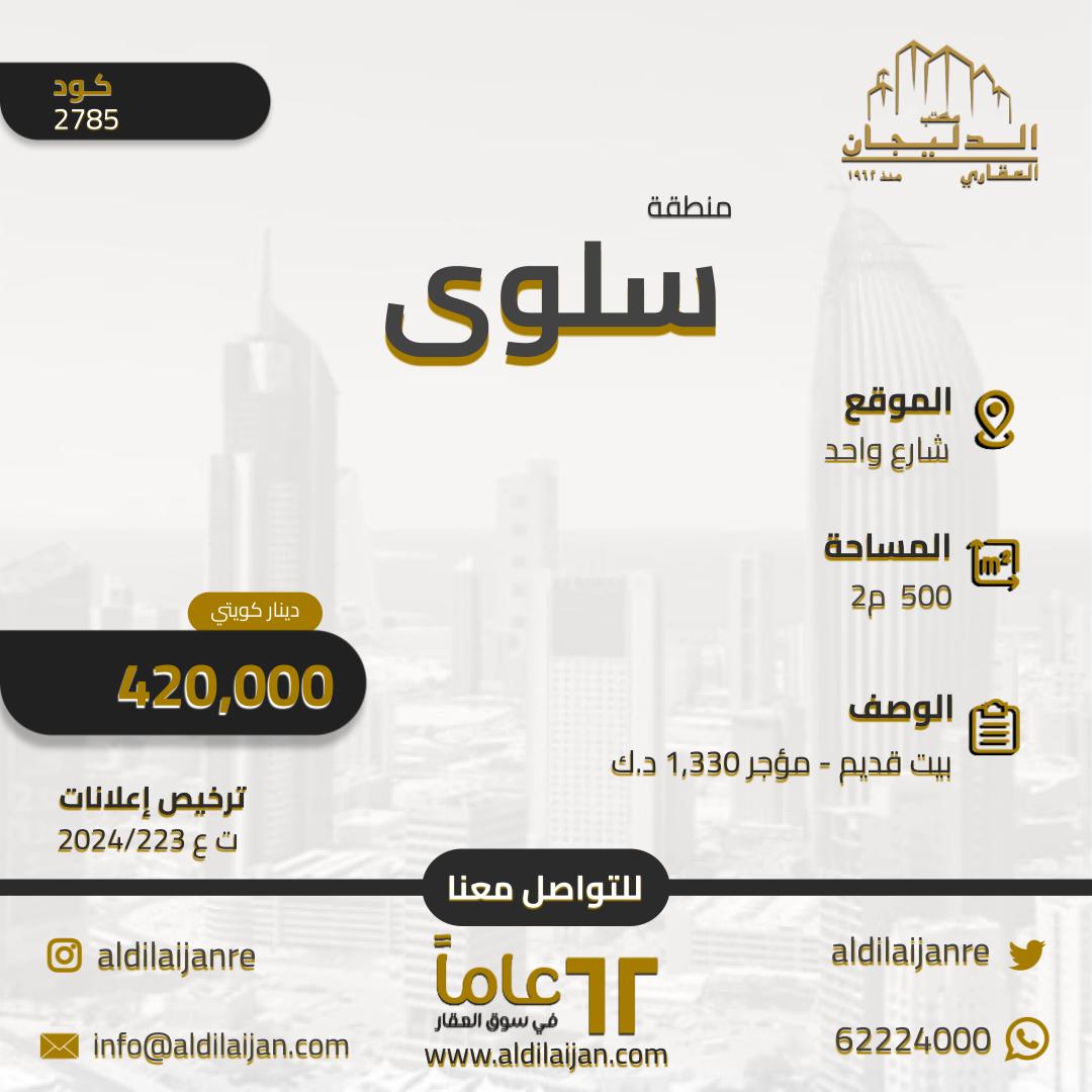 بيت قديم للبيع فى منطقه سلوى Share ملخص للبيع بيت قديم فى منطقة سلوى ، مساحته 500 متر مربع ، يقع على شارع واحد ، كود 2785 ، مراجعة 420,000 د.ك التفاصيل Page Views الأماكن القريبة من جوجل Close