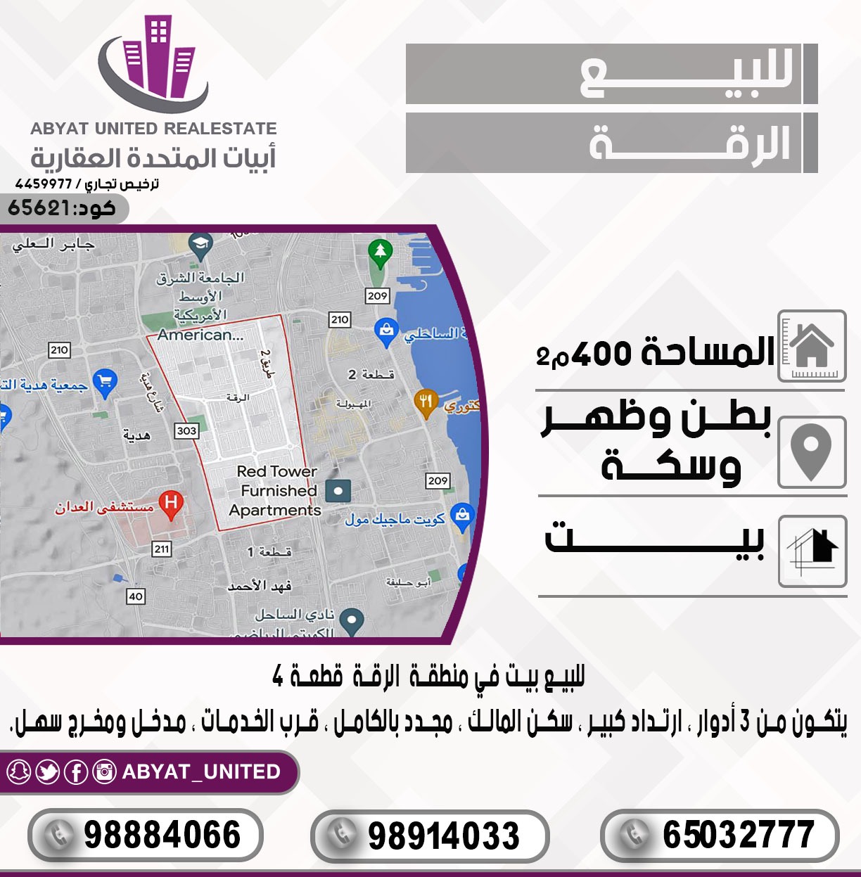 للبيع بيت فى منطقة الرقة قطعة 4 ، الموقع بطن وظهر وسكة ، المساحة 400 متر مربع ، يتكون من 3 ادوار ، ارتداد كبير ، سكن المالك ، مجدد بالكامل ، قرب الخدمات ، مدخل ومخرج سهل .