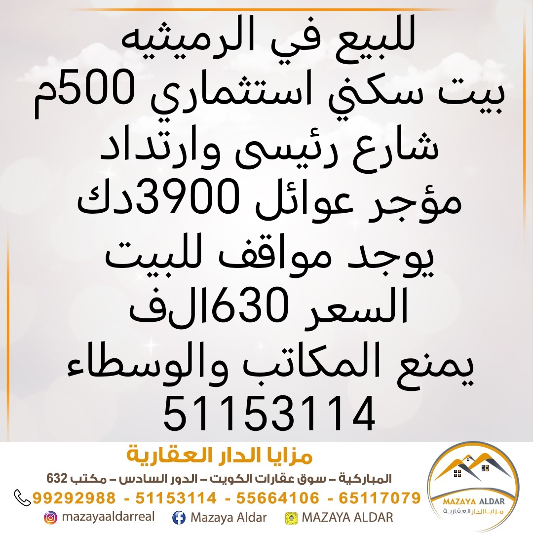 بيت للبيع فى الرميثيه استثمارى Share ملخص للبيع في الرميثيه ، بيت سكني استثماري ، مساحته 500متر مربع ، شارع رئيسى وارتداد مؤجر عوائل 3900 د.ك ، يوجد مواقف للبيت , السعر 630 ألف د.ك يمنع المكاتب والوسطاء ، شركة مزايا الدار العقارية التفاصيل Page Views الأماكن القريبة من جوجل Close