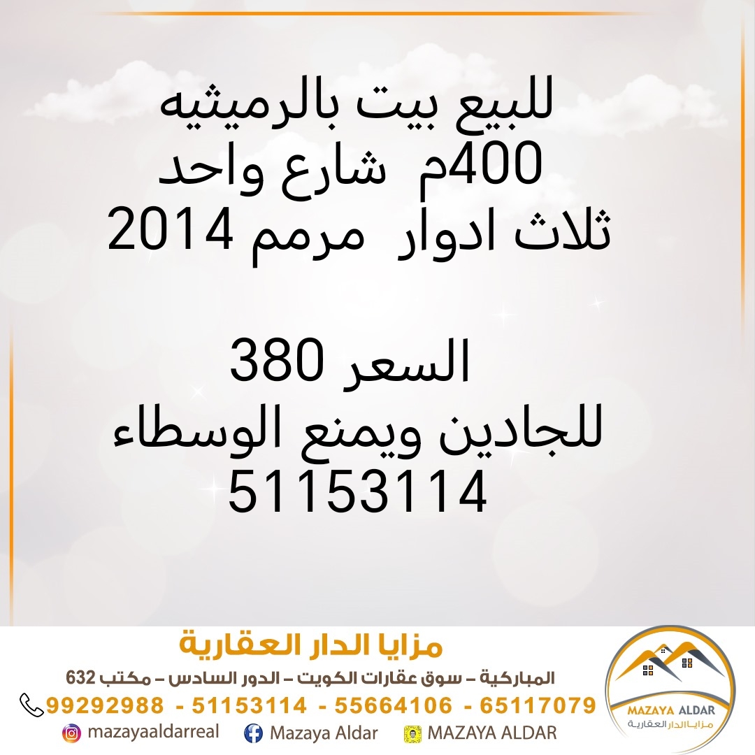 بيت للبيع فى الرميثيه ثلاث أدوار Share ملخص للبيع بيت بالرميثيه ، مساحته 400 متر مربع ، الموقع شارع واحد ، يتكون ثلاث ادوار ، الترميم 2014 ، السعر 380 ألف د.ك للجادين ويمنع الوسطاء التفاصيل حالة: للبيع Page Views الأماكن القريبة من جوجل خصائص ذات صلة للبيع تجربة عنصر للبيع abdulrahman منذ أسبوعين للبيع د.ك111111 شقة تجربة عقار جديد خليل بوست أسرة: 666666 الحمامات: 666666 admin منذ 3 أسابيع Close