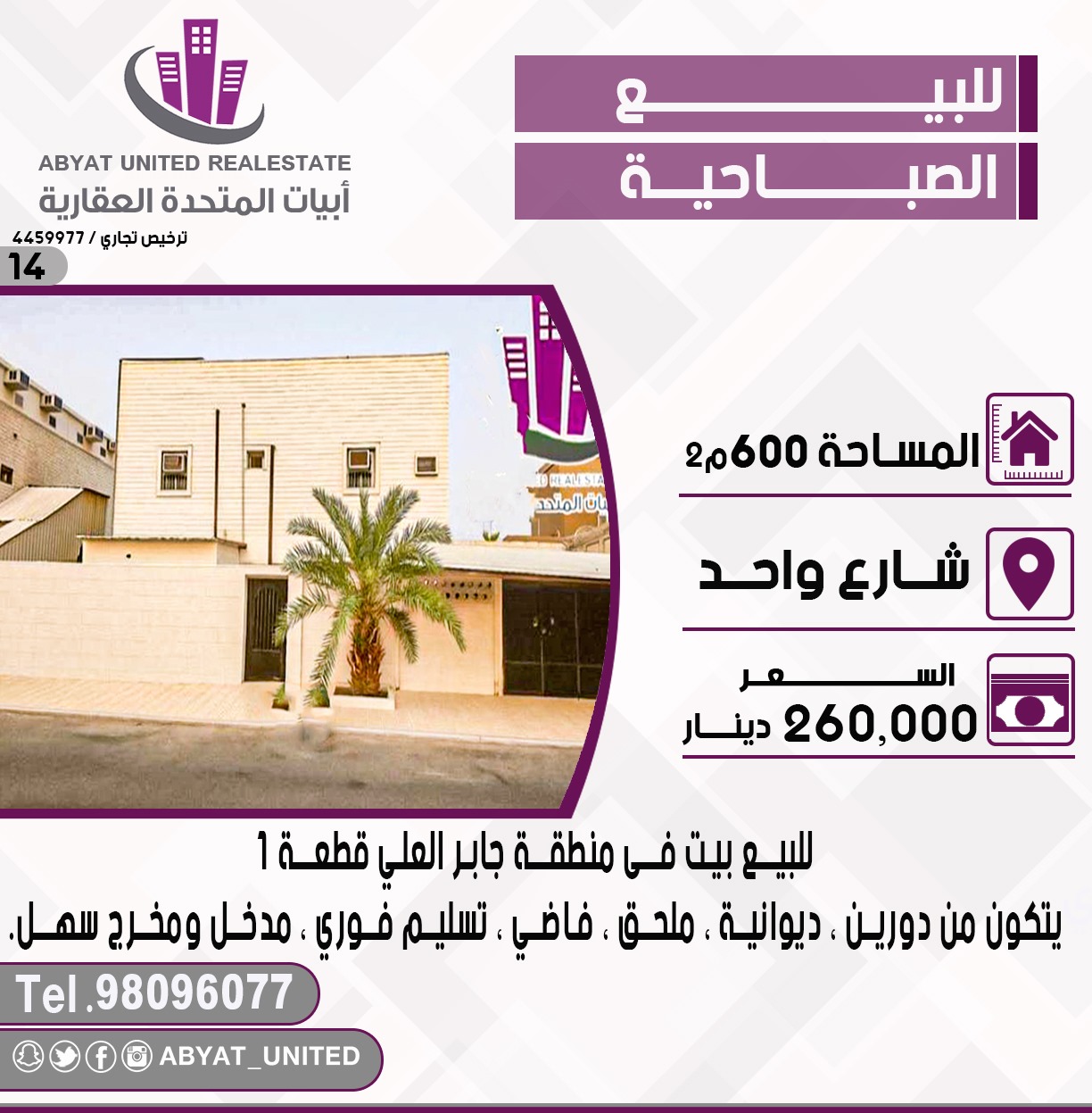 بيت للبيع فى الصباحية تسليم فورى Share ملخص للبيع بيت فى منطقه الصباحية قطعه 1 ، الموقع شارع واحد ، المساحة 600 متر مربع ، يتكون من دورين ، ديوانية ، ملحق ، تسليم فوري ، مدخل ومخرج سهل ، للاستفسار ، النقال 1 98096077 ، السعر 260 ألف دينار ، الكود 4 التفاصيل حالة: للبيع Page Views الأماكن القريبة من جوجل خصائص ذات صلة للبيع تجربة عنصر للبيع abdulrahman منذ 3 أسابيع للبيع أرض زاويه للبيع فى الرميثيه admin منذ شهر واحد Close