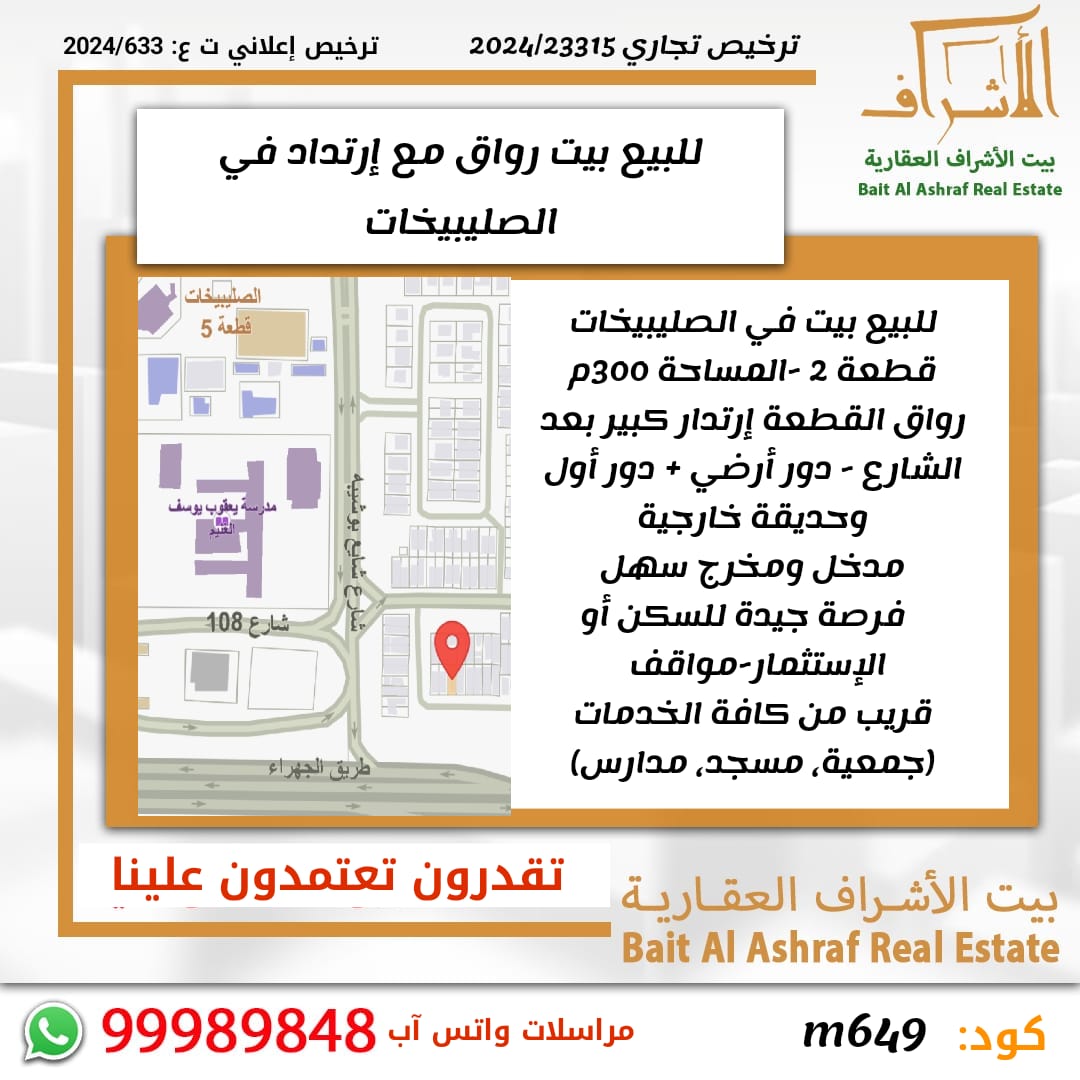 للبيع بيت فى الصليبيخات قطعة 2 ، مساحته 300 متر مربع ، رواق القطعة مع إرتدار كبير بعد الشارع و دور أرضي دور أول وحديقة خارجية ، مدخل ومخرج سهل ، فرصة جيدة للسكن أو الإستثمار و مواقف قريب من كافة الخدمات جمعية ، مسجد ، مدارس .