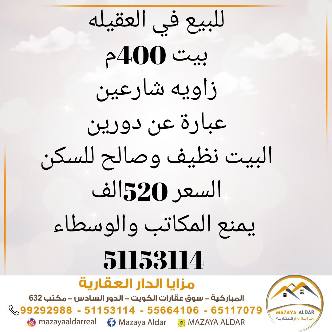 بيت للبيع فى العقيله من دورين Share ملخص للبيع فى العقيله بيت ، المساحة 400 متر مربع ، الموقع زاويه شارعين ، عبارة عن دورين ، البيت نظيف وصالح للسكن ، السعر 520 ألف د.ك ، يمنع المكاتب والوسطاء ، 51153114 التفاصيل حالة: للبيع Page Views الأماكن القريبة من جوجل خصائص ذات صلة للبيع تجربة عنصر للبيع abdulrahman منذ أسبوعين للبيع د.ك111111 شقة تجربة عقار جديد خليل بوست أسرة: 666666 الحمامات: 666666 admin منذ 3 أسابيع Close