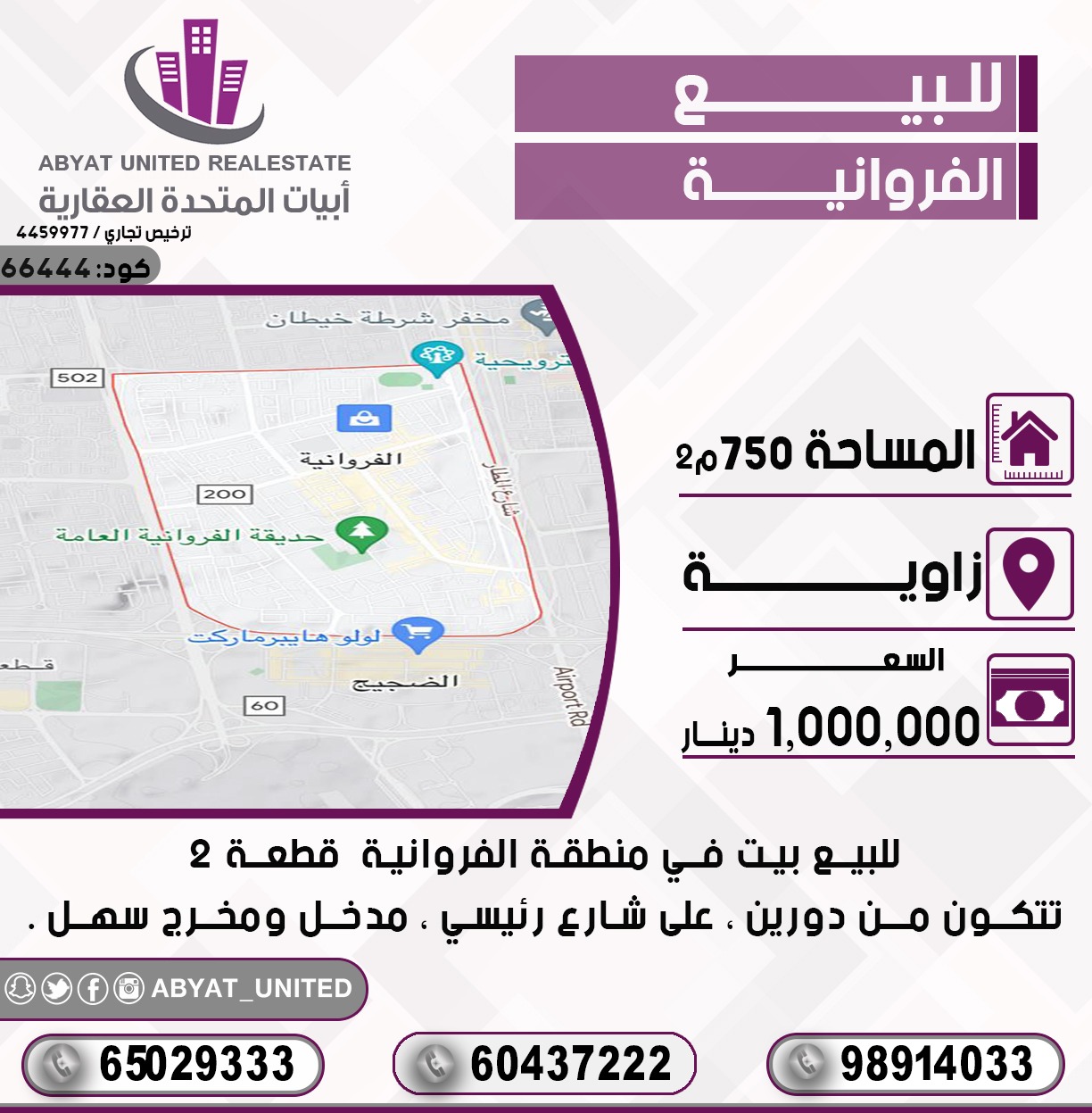 للبيع بيت في منطقة الفروانية ، قطعه 2 ، يقع على زاوية ، مساحته 750 متر مربع ، يتكون من دورين ، على شارع رئيسي ، مدخل ومخرج سهل ، للاستفسار ، النقال 1 ، 65029333 ، النقال 2 ، 60437222 ، النقال3 ، 989140333 ، السعر 1.000.000 د.ك ، الكود 66444