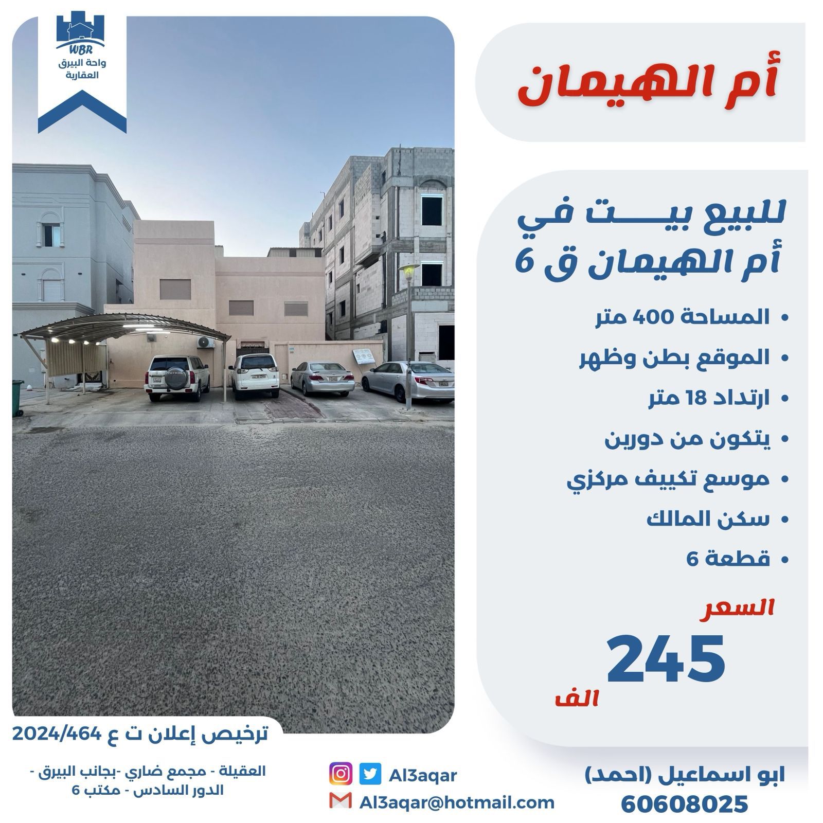 بيت للبيع فى ام الهيمان سكن المالك Share ملخص للبيع بيت فى ام الهيمان ، قطعة 6 ، المساحة 400 متر مربع ، الموقع بطن وظهر ، ارتداد 18 متر ، يتكون من دورين تكييف مركزي ، سكن المالك ، السعر 245 ألف د.ك التفاصيل حالة: للبيع Page Views الأماكن القريبة من جوجل خصائص ذات صلة للبيع تجربة عنصر للبيع abdulrahman منذ 3 أسابيع للبيع د.ك111111 شقة تجربة عقار جديد خليل بوست أسرة: 666666 الحمامات: 666666 admin منذ 4 أسابيع Close