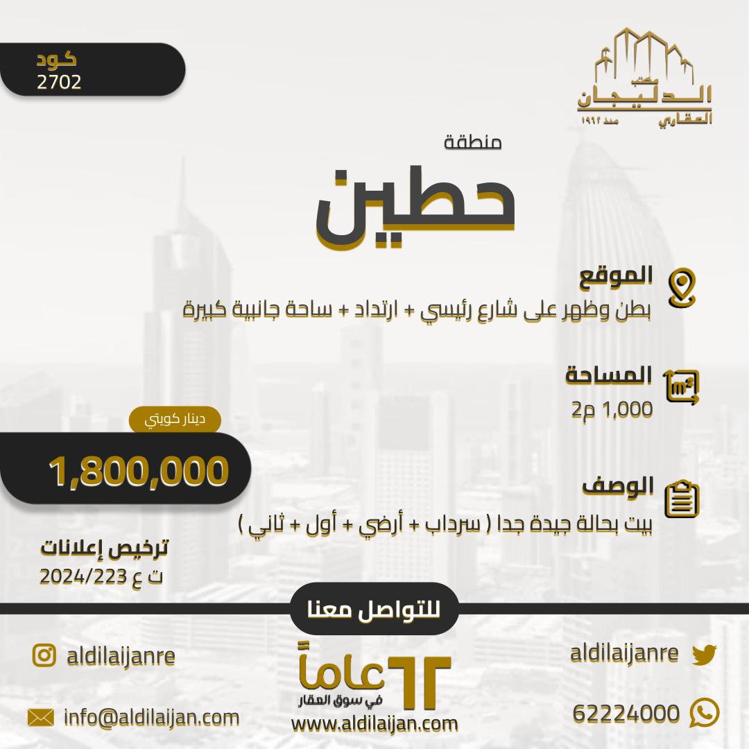 بيت بحالة جيدة جدا ، مساحته 1,000 متر مربع ، يقع على بطن وظهر على شارع رئيسي ، ارتداد ، ساحة جانبية كبيرة ، كود 2702 ، مراجعة 1,800,000 د.ك
