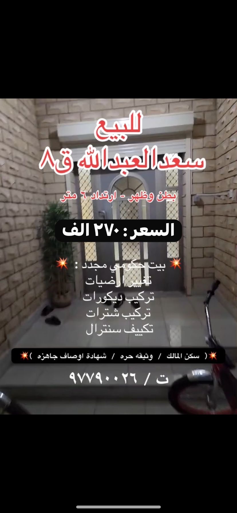 فرصه بيع سريعه للجادين ، بسعر ممتاز 270 ألف د.ك ، للبيع بيت حكومي فى سعدالعبدالله ، قطعة 8 على وضعه ، يقع على بطن وظهر مع إرتداد 6 متر ، مخرج ومدخل سهل ، مساحته 400 متر مربع ، الملاحظات البيت سكن المالك نظيف ومرتب يوجد وثيقه حره و شهادة اوصاف جاهزه ، مجدد بالكامل وراعيه خسران عليه ، الإضافات عبارة عن ديكورات و شترات و ارضيات وتكييف سنترال ، مؤسسة السور الذهبي العقاريه