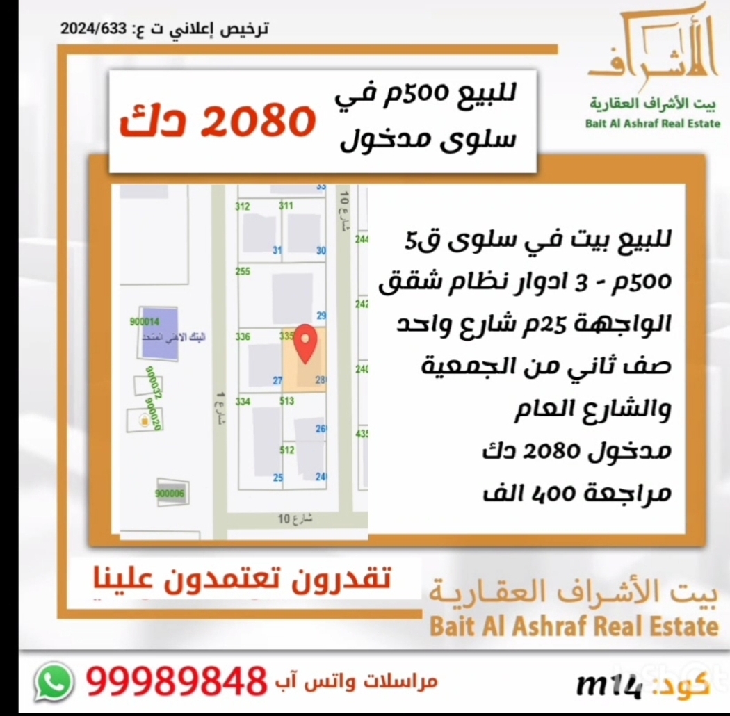 بيت للبيع فى سلوى قطعه 5 ، مساحته 500 متر مربع ، يتكون من ثلاث ادوار ، نظام شقق الواجهه 25 متر يقع على شارع واحد صف ثاني من الجمعيه من الشارع العام ، مدخول 2080 دينار ، مراجعه 400 ألف دينار ، كود m 14 , ترخيص اعلان 634 , 2024 , مراسلات وتساب 99989848