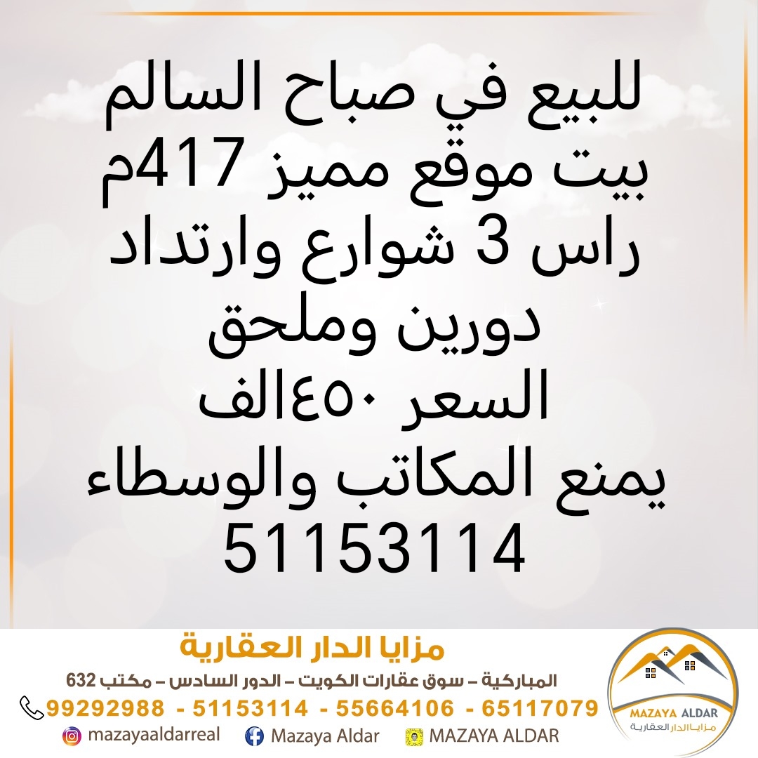بيت للبيع فى صباح السالم موقع مميز Share ملخص للبيع في صباح السالم ، بيت موقع مميز 417 متر مربع ، يقع على راس 3 شوارع وارتداد ، يتكون من دورين وملحق السعر 450 ألف د.ك يمنع المكاتب والوسطاء التفاصيل حالة: للبيع Page Views الأماكن القريبة من جوجل خصائص ذات صلة للبيع تجربة عنصر للبيع abdulrahman منذ أسبوعين للبيع د.ك111111 شقة تجربة عقار جديد خليل بوست أسرة: 666666 الحمامات: 666666 admin منذ 3 أسابيع Close