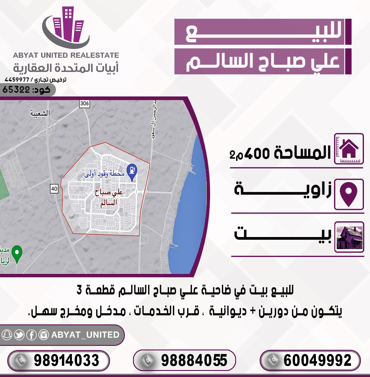 بيت للبيع فى ضاحيه صباح السالم Share ملخص للبيع بيت في ضاحية على صباح السالم قطعة 3 ، يقع على زاوية ، مساحته 400 متر مربع ، يتكون من دورين ، ديوانية ، قرب الخدمات ، مدخل ومخرج سهل . للاستفسار النقال 1 98914033 ، النقال 2 98884055 ، النقال 3 60049992 ، الكود 65322 التفاصيل Page Views الأماكن القريبة من جوجل Close
